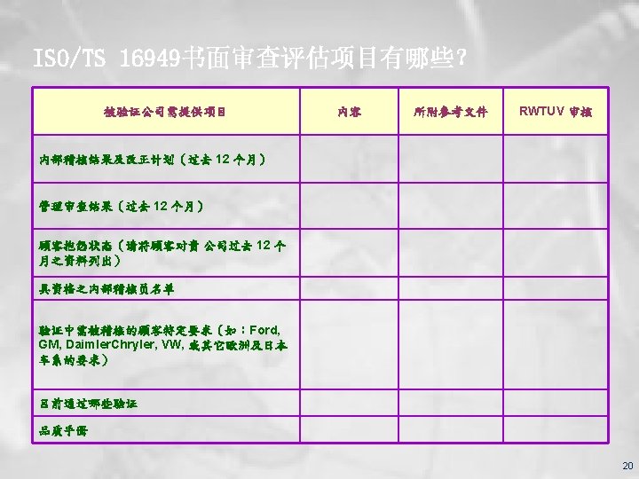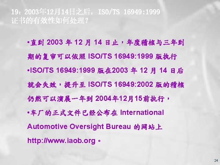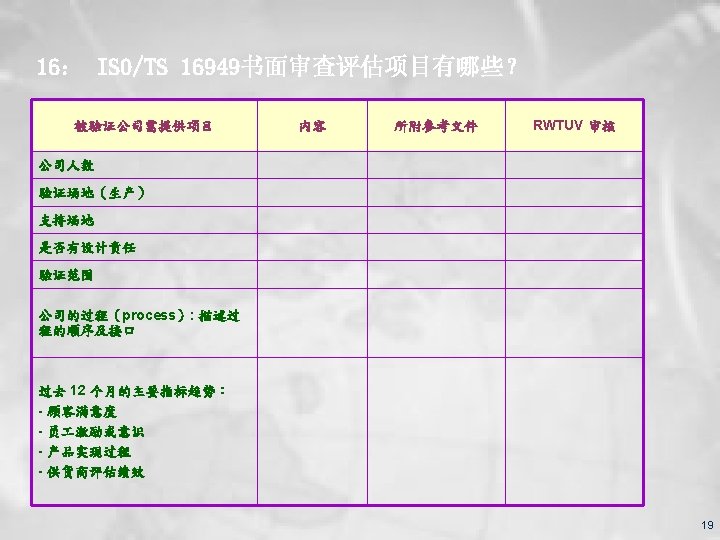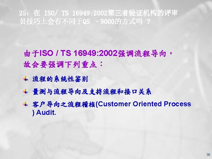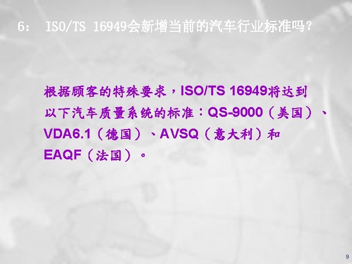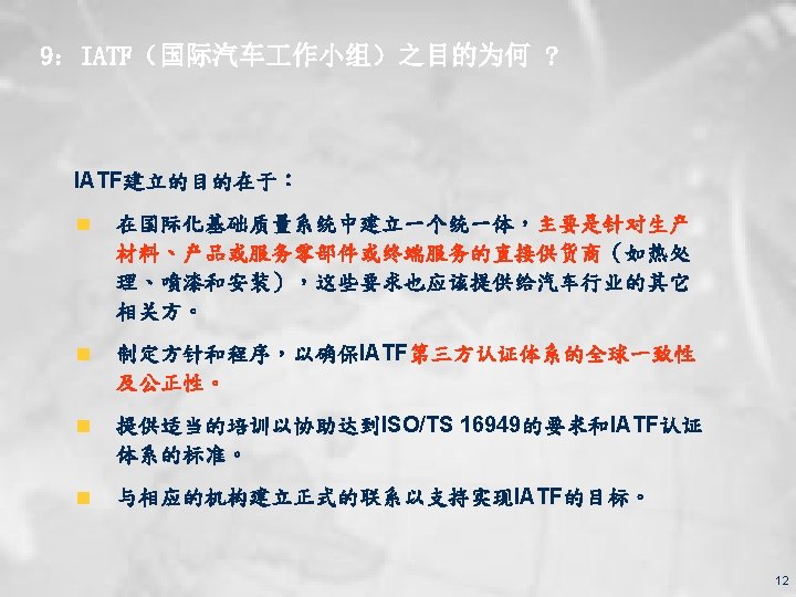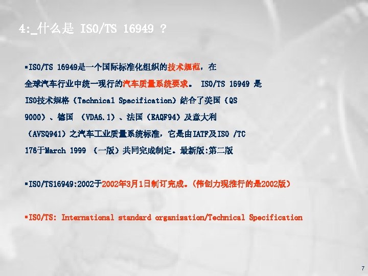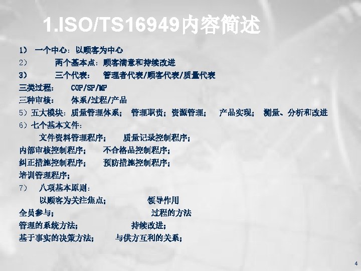 ISOTS 16949 AWARENESS TRAINING ISOTS 16949 8 IATF Slides: 31 Download presentation ISO/TS 16949 AWARENESS TRAINING ISO/TS 16949 意识培训 8:什么是 IATF(国际汽车 作小组) ? IATF(International Automotive Task Force)包含汽车制造商(BMW, Daimler Chrysler, Fiat, Ford, General Motors, PSA Peugeot-Citroen, Renault SA and Volkswagen)及AIAG(U. S. A)、ANFIA (Italy) 、CCFA/FIEV(French) 、 SMMT (U. K)and VDA (Germany) 。 11 11: ISO/TS 16949是否会取代 QS 9000? AIAG无计划修订 QS 9000 : 1998 要求以反应 ISO 9000 : 2000 之改变,但QS 9000: 1998的 有效期限将到 2006年 12月14日止。2003年 12 月15日到 2006年 12月14日QS 9000: 1998将成 为独立的标准存在。2003年 12月15日到 2006 年 12月14日宣称符合QS 9000之厂商, 要另申 请ISO 9001: 2000才是ISO 9001验证符合厂商。 14 12:ISO/TS 16949有哪些效益? • Continuous improvement 持续改进 • Defect prevention 预防缺陷 • Reduction of variation 减少偏差 • Reduction of waste 降低浪费 15 23 21:ISO/TS 16949的五大 具是什么? • APQP:Advanced product quality planning • PPAP: Production Part Approval Process • FMEA: Potential Failure Mode and Effect Analysis • MSA: Measurement System Analysis • SPC: Statistical Process Control 26 32