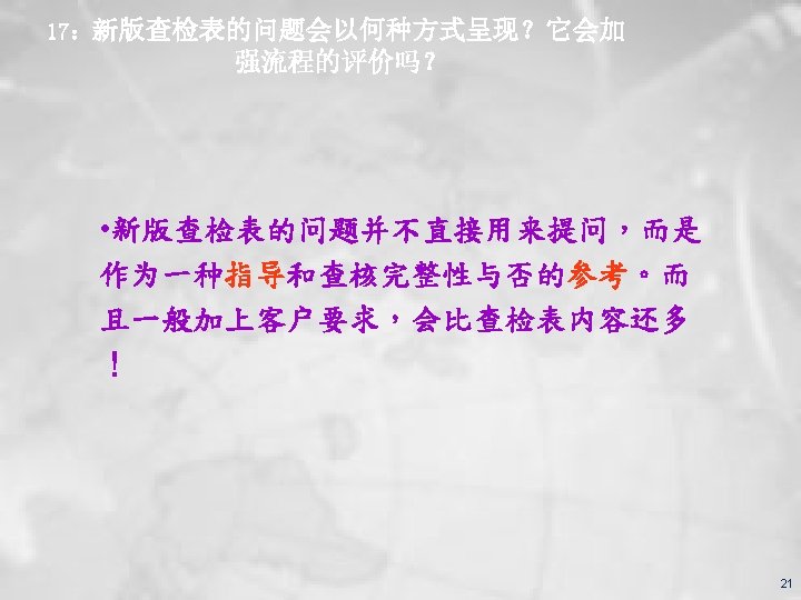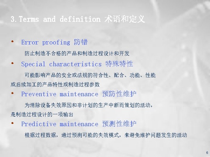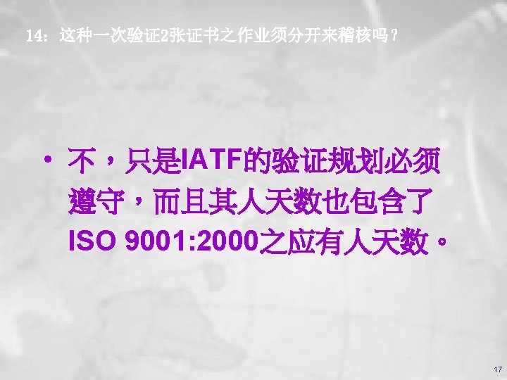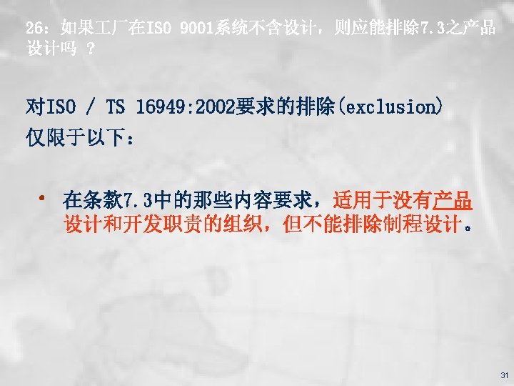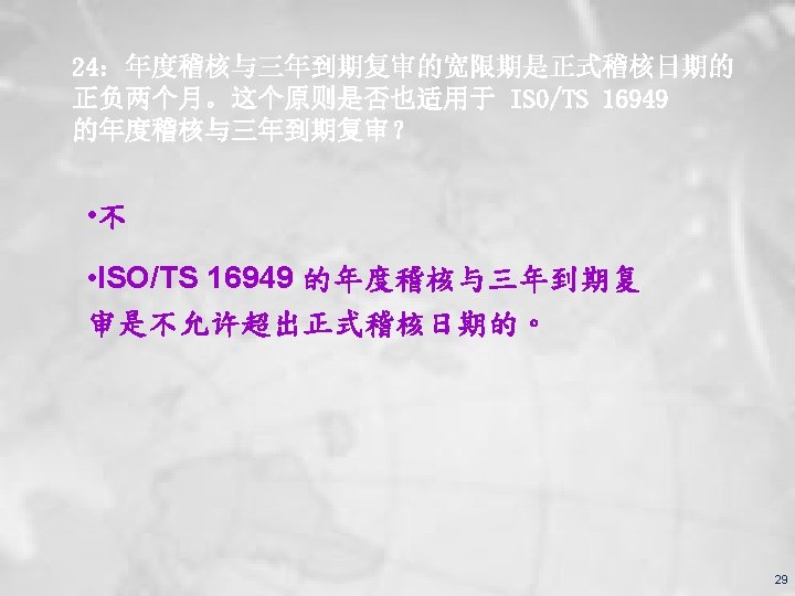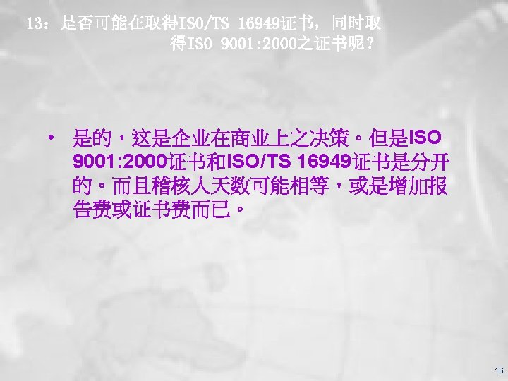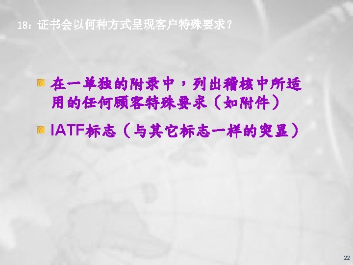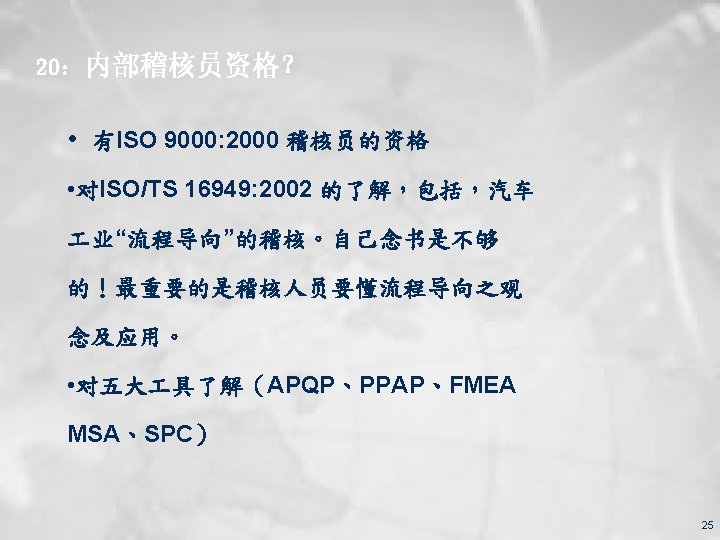 ISOTS 16949 AWARENESS TRAINING ISOTS 16949 8 IATF Slides: 31 Download presentation ISO/TS 16949 AWARENESS TRAINING ISO/TS 16949 意识培训 8:什么是 IATF(国际汽车 作小组) ? IATF(International Automotive Task Force)包含汽车制造商(BMW, Daimler Chrysler, Fiat, Ford, General Motors, PSA Peugeot-Citroen, Renault SA and Volkswagen)及AIAG(U. S. A)、ANFIA (Italy) 、CCFA/FIEV(French) 、 SMMT (U. K)and VDA (Germany) 。 11 11: ISO/TS 16949是否会取代 QS 9000? AIAG无计划修订 QS 9000 : 1998 要求以反应 ISO 9000 : 2000 之改变,但QS 9000: 1998的 有效期限将到 2006年 12月14日止。2003年 12 月15日到 2006年 12月14日QS 9000: 1998将成 为独立的标准存在。2003年 12月15日到 2006 年 12月14日宣称符合QS 9000之厂商, 要另申 请ISO 9001: 2000才是ISO 9001验证符合厂商。 14 12:ISO/TS 16949有哪些效益? • Continuous improvement 持续改进 • Defect prevention 预防缺陷 • Reduction of variation 减少偏差 • Reduction of waste 降低浪费 15 23 21:ISO/TS 16949的五大 具是什么? • APQP:Advanced product quality planning • PPAP: Production Part Approval Process • FMEA: Potential Failure Mode and Effect Analysis • MSA: Measurement System Analysis • SPC: Statistical Process Control 26 32