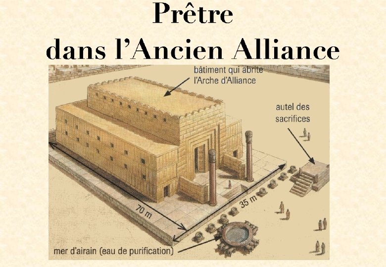 Les prêtres de l’Ancienne Alliance Autant des patriarches, les chefs de famille offraient des sacrifices. Durant l’exode Moïse confie le sacerdoce à Aaron et et à la tribu de Lévi, dont les fils sont alors attaché aux divers sanctuaire du pays, alors que le culte familial continue. Ils vivent de la dîme. Le prêtre reçoit une consécration qui le fait passer de la vie profane au domaine du sacré : onction, bains, vêtements, sacrifices. Avec la construction du temple, Salomon confie le sacerdoce du temple à Sadoc. Ses descendants se diront descendant d’Aaron ou de Lévi et occuperont les fonctions sacerdotale du temple. Josias roi de Judas centralise le culte à Jérusalem en 640– 609. Durant l’exil, les prêtres seront les guides religieux du peuple et les symboles de l’identité d’Israël. Au retour de l’exil, le grand prêtre devient le chef religieux et politique de la nation. Il est successeur d’Aaron, fils de Sadoc. Sa consécration rappelle celle du roi. En dessous de lui ils viennent les prêtres (24 classes), puis les lévites, clergé inférieur (24 classes). Les macchabées, famille sacerdotale qui mène la résistance contre le roi Antiochus IV, fonde la dynastie des grands-prêtres-roi Asmonéen, dernière époque de quasi-indépendance d’Israël, avant la conquête romaine en -63. À partir d’Hérode Le Grand, les grands prêtres sont désignés par les Romains. Ainsi Caïphe restera en fonction pendant 18 ans, de 18 à 36.