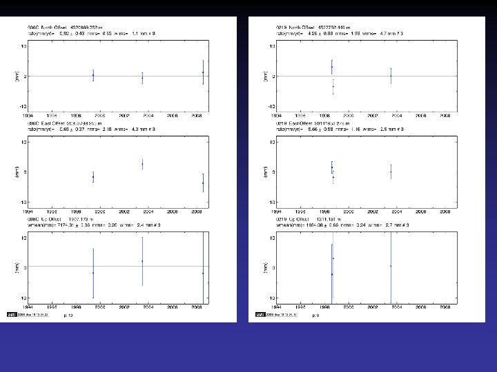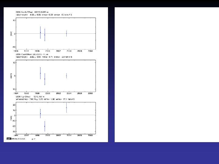 Time series of monthly position estimates for continuous site BURN Wrms ~ 1 mm N, E ~ 3 mm U Rate uncertainties < 0. 2 mm/yr N, E 0. 7 mm/yr U do not include random walk added for velocity estimates