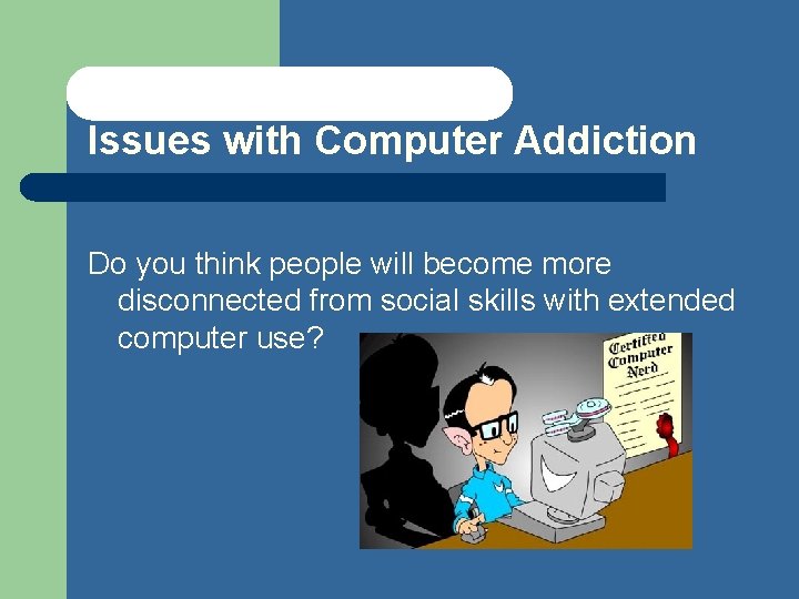 Issues with Computer Addiction Do you think people will become more disconnected from social skills with extended computer use?