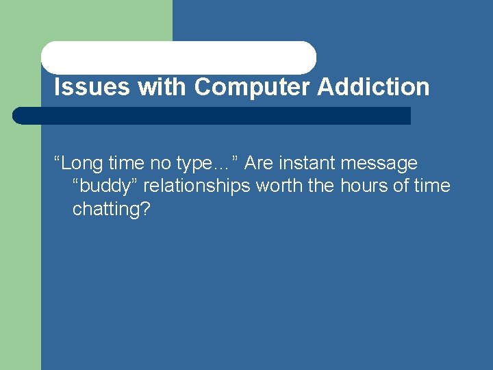 Issues with Computer Addiction “Long time no type…” Are instant message “buddy” relationships worth the hours of time chatting?