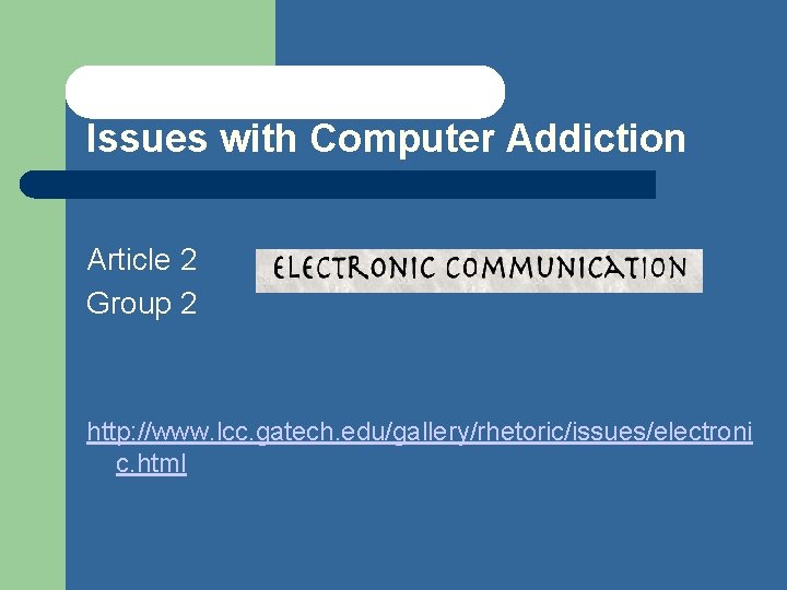 Issues with Computer Addiction Article 2 Group 2 http: //www. lcc. gatech. edu/gallery/rhetoric/issues/electroni c. html