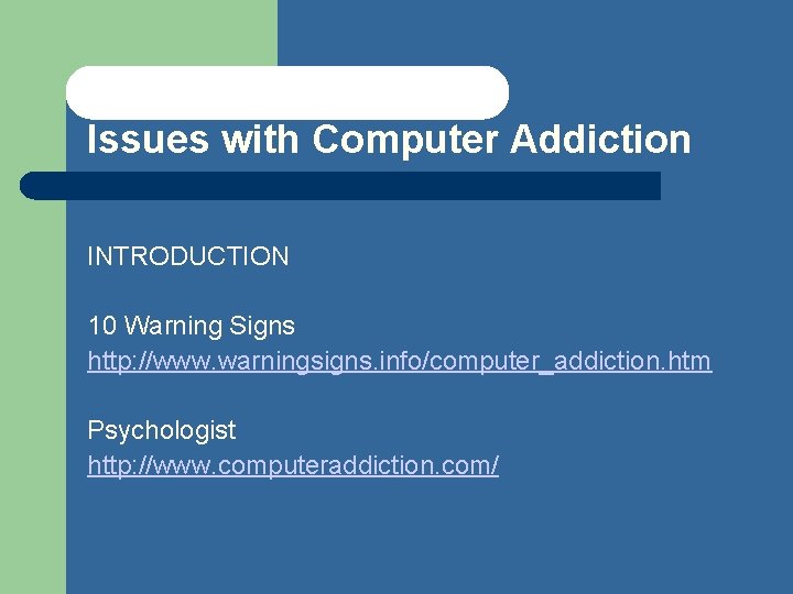 Issues with Computer Addiction INTRODUCTION 10 Warning Signs http: //www. warningsigns. info/computer_addiction. htm Psychologist http: //www. computeraddiction. com/