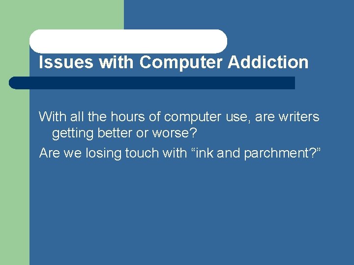 Issues with Computer Addiction With all the hours of computer use, are writers getting better or worse? Are we losing touch with “ink and parchment? ”
