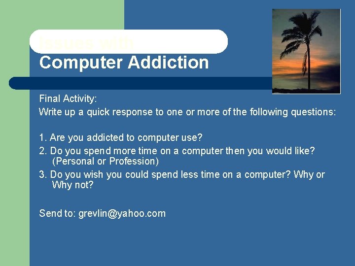 Issues with Computer Addiction Final Activity: Write up a quick response to one or more of the following questions: 1. Are you addicted to computer use? 2. Do you spend more time on a computer then you would like? (Personal or Profession) 3. Do you wish you could spend less time on a computer? Why or Why not? Send to: grevlin@yahoo. com