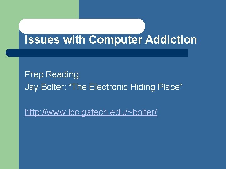 Issues with Computer Addiction Prep Reading: Jay Bolter: “The Electronic Hiding Place” http: //www. lcc. gatech. edu/~bolter/