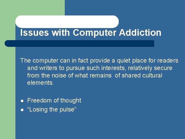 Issues with Computer Addiction The computer can in fact provide a quiet place for readers and writers to pursue such interests, relatively secure from the noise of what remains of shared cultural elements. l l Freedom of thought “Losing the pulse”