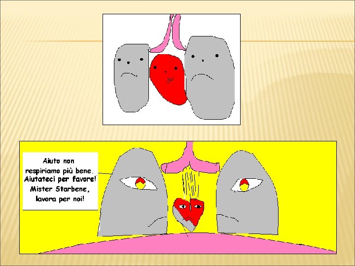 Per aiutare Mister Starbene a risolvere il suo problema gli abbiamo preparato delle immagini da mostrare ai cervelli quando farà la riunione di cui ci ha parlato. Sono disegni che abbiamo fatto noi in Paint e rappresentano i polmoni e il cuore di un fumatore: forse, vedendoli i cervelli si renderanno conto che conviene smettere di fumare!