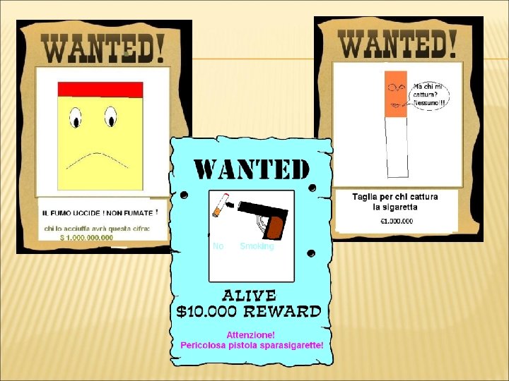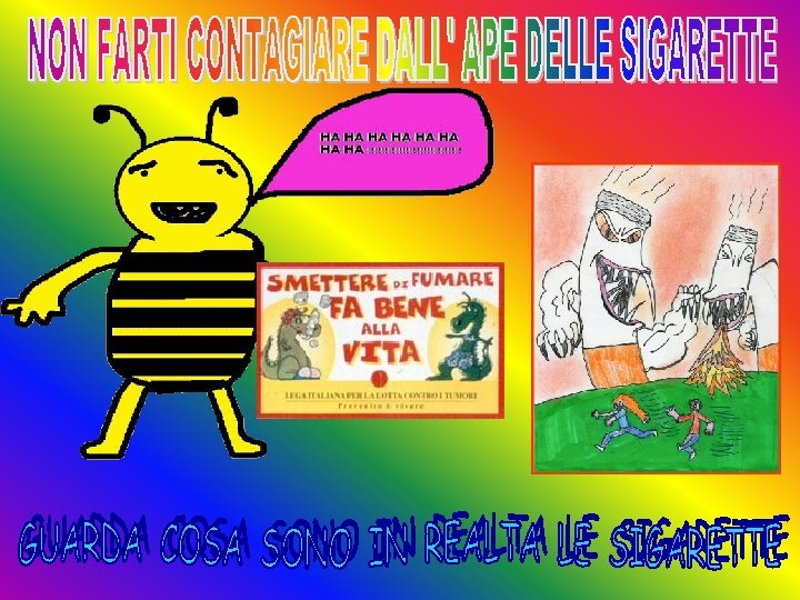 CAMPAGNA PUBBLICITARIA! Sappiamo benissimo che per convincere le persone a fare certe cose vengono usati in TV e sui giornali dei messaggi pubblicitari convincenti. Allora abbiamo pensato di creare con Power. Point delle diapositive-spot pubblicitari. Le proietteremo durante la festa di fine anno e speriamo così di convincere i nostri familiari che fumano a smettere subito! Inoltre le invieremo a Mister Starbene così potrà usarle nelle sue riunioni con i cervelli umani, chissà che qualcuno non cambi idea!