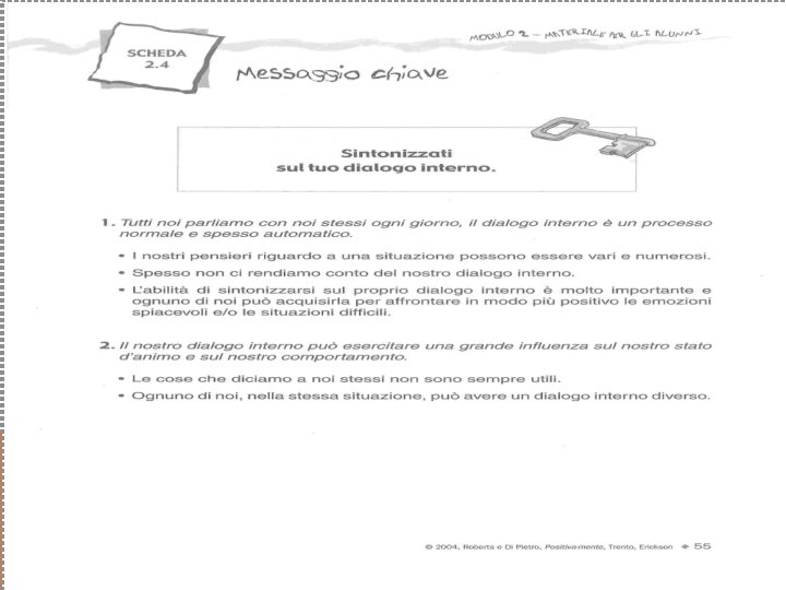 COME PRESENTARE AL BAMBINO IL CONCETTO DI DIALOGO INTERNO 1) Osservazioni 2) spiegare al bambino il concetto di DIALOGO INTERNO nel modo più semplice possibile : potrebbe essere utile prendere spunto da una situazione problematica riferendo cosa succedeva a noi quando eravamo piccoli… 3) Iniziare il lavoro di trasformazione dei Allora ad un bambino arrabbiato con un suo amico potremmo dire: “quando ero piccolo anche a me capitava di litigare con qualche amico. Allora cominciavo a dirmi che lui era stato cattivo, che non doveva trattarmi così e che non volevo più essere suo amico. Pesare a queste cose mi faceva veramente arrabbiare. Ma non è piacevole essere arrabbiati per molto tempo e questo succede per colpa di certi pensieri che ci passano per la testa. A te cosa è capitato di pensare?