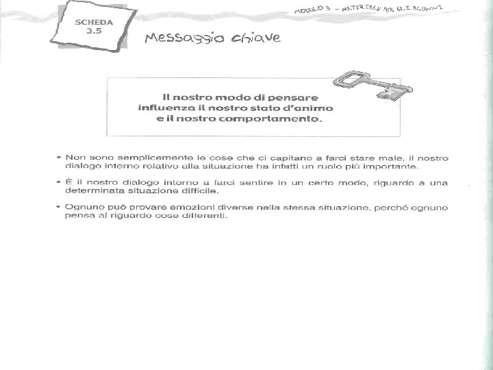 SI PUÒ ANCHE PARTIRE DIRETTAMENTE DA CIÒ CHE SI È OSSERVATO NEL BAMBINO, MAGARI SCEGLIENDO EPISODI POSITIVI. AD ESEMPIO: Ho notato che a volte, quando ti arrampichi su un albero dici: “scommetto che ce la posso fare …”, Oppure… Ho notato che quando fai una partita con un videogioco dici “ questa volta farò ancora più punti…” Questo è un modo di pensare che ti aiuta a fare sempre meglio…” Si potrà allora precisare meglio il concetto dicendo: “Tutti quanti, dentro di noi , ci diciamo delle cose. A seconda di come parliamo a noi stessi possiamo sentirci meglio oppure peggio”