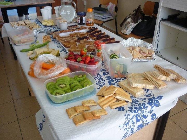 As we don’t have lunch at school we organized a healthy snack in the breaktime. Everyone brought something to eat avoiding any kindof junk food. Fruit: kiwis, straberries, apples, bananas, …. Vegetables: carrots, cucumbers, tomatoes, fennels, faves, courgettes……. . Rice crackers, ham and cheese sandwiches, apricot pie, bread and berries jam and honey, yoghurt, orange juice and water