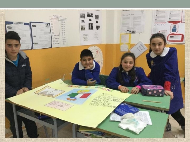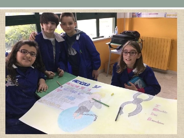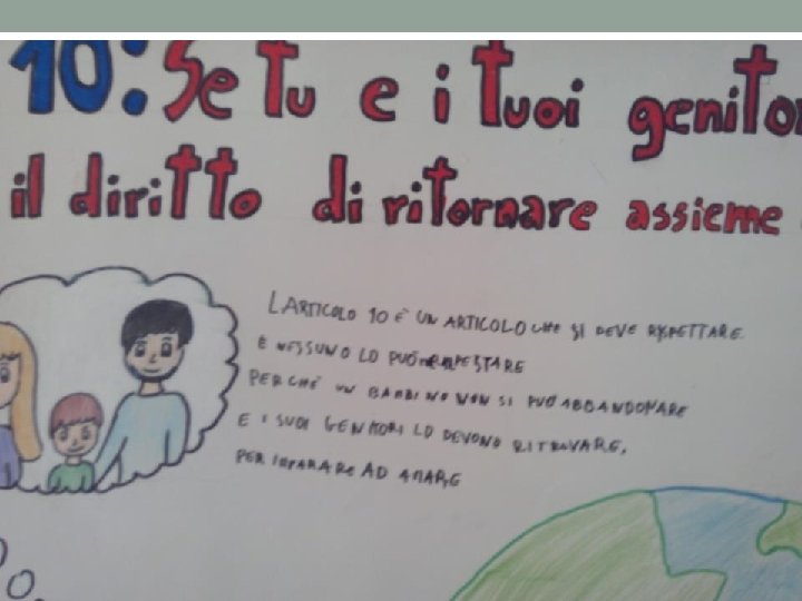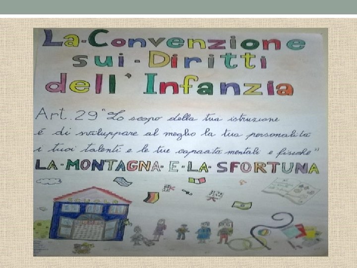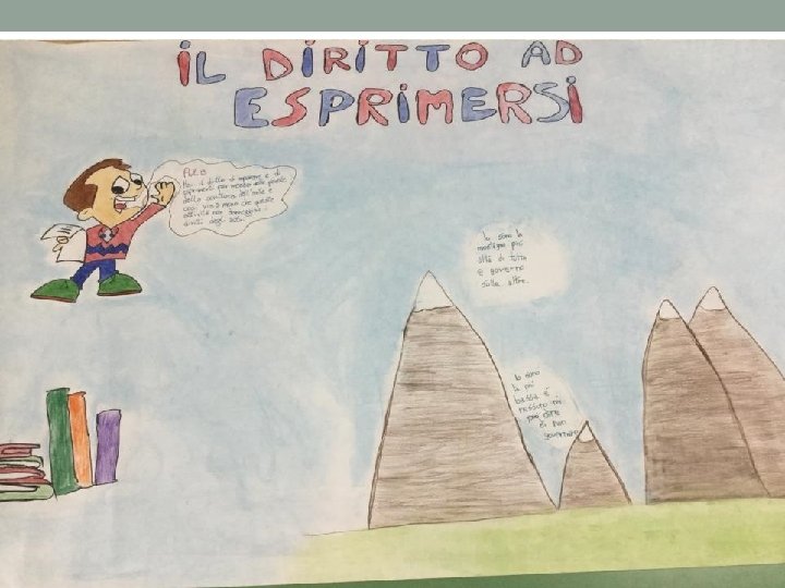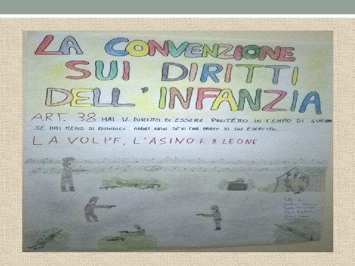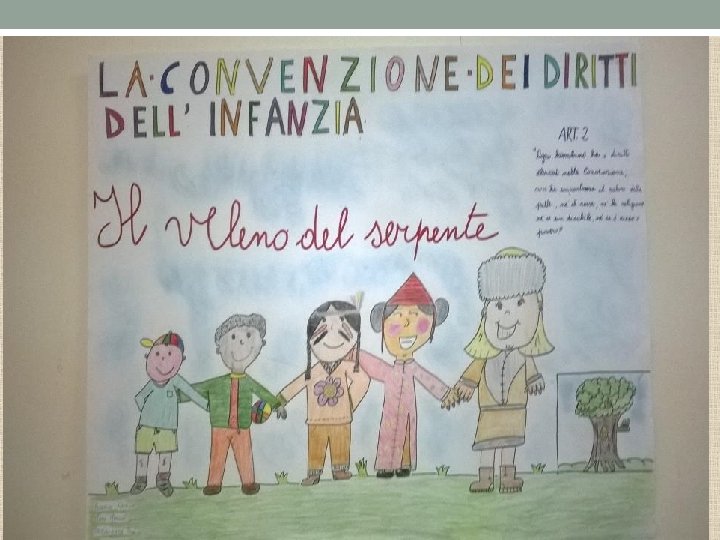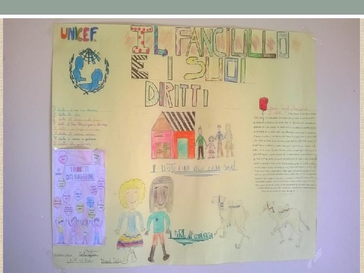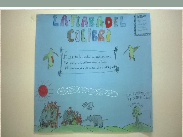 Ultima fase di lavoro Nell’ultima fase di lavoro gli alunni di quinta e gli alunni di scuola secondaria di I° grado illustrano, su cartellone, un diritto narrato in ciascuna fiaba che hanno letto.