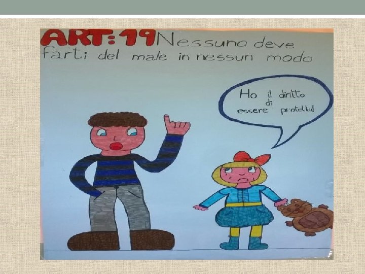 I diritti dell’infanzia Ciascun articolo della Convenzione spiega uno dei tuoi diritti. Hai il diritto di sapere quali sono i tuoi diritti e anche gli adulti devono conoscerli. Art. 42 Tutti gli adulti e tutte le bambine e i bambini devono sapere che esiste questa Convenzione.