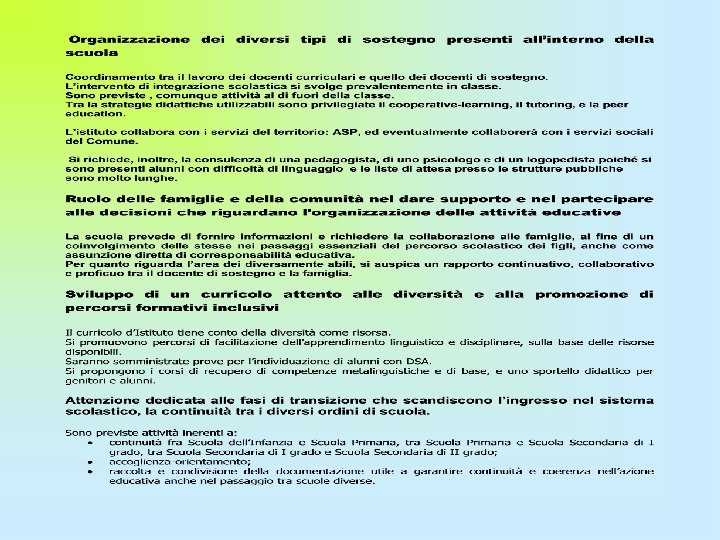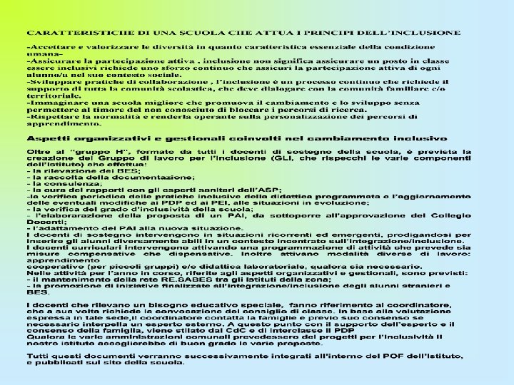 Sintesi dei punti di forza e di criticità rilevati*: Aspetti organizzativi e gestionali coinvolti nel cambiamento inclusivo Possibilità di strutturare percorsi specifici di formazione e aggiornamento degli insegnanti Adozione di strategie di valutazione coerenti con prassi inclusive; Organizzazione dei diversi tipi di sostegno presenti all’interno della scuola Acquisizione e distribuzione di risorse aggiuntive utilizzabili per la realizzazione dei progetti di inclusione Ruolo delle famiglie e della comunità nel dare supporto e nel partecipare alle decisioni che riguardano l’organizzazione delle attività educative; Sviluppo di un curricolo attento alle diversità e alla promozione di percorsi formativi inclusivi; Valorizzazione delle risorse esistenti Attuazione del PDP per tutti gli alunni con DSA-BES certificati e non, la cui famiglia acconsente alla predisposizione Numero delle risorse di sostegno favore degli alunni con disabilità Numero di assistenti di base su alunni con gravi disabilità Utilizzo di software specifici per alunni BES Numero di alunni stranieri non alfabetizzati o con scarsa conoscenza della lingua italiana Attenzione dedicata alle fasi di transizione che scandiscono l’ingresso nel sistema scolastico, la continuità tra i diversi ordini di scuola. Presenza di docenti titolari di funzione strumentale area 2 Altro: incontri con il personale ASL a colloqui sui casi BES Altro: presenza lim e P. C. nei plessi Altro: protocollo d’intesa con associazioni del territorio Altro: procedure che si sono create negli anni scorsi e che si proporranno anche per quelle a venire, se i finanziamenti saranno sufficienti alla loro progettazione 0 1 2 3 4 X X X X x X X X * = 0: per niente 1: poco 2: abbastanza 3: molto 4 moltissimo Adattato dagli indicatori UNESCO per la valutazione del grado di inclusività dei sistemi scolastici PROPOSTE Si propone di predisporre un elenco dei software presenti in tutto l’istituto. Adeguata strumentazione per alunni con deficit e DSA, rapporti con il CTRH