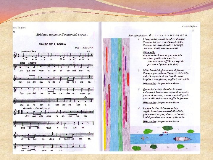 ACQUA E MATERIA”: COLORI E SUONI DELL’ACQUA E DELLA TERRA Alla scoperta della “Civiltà dei fiumi” Laboratorio intergenerazionale degli alunni di classe quarta con anziani Il progetto è stato proposto agli insegnanti di classe quarta dall’Associazione di volontariato “Centro anch’io” di Oriago ed è stato accolto poiché si avvicina al focus previsto per l’anno in corso: il fiume e le Civiltà dei Fiumi. Gli obiettivi che con tale progetto si sono voluti sviluppare sono soprattutto trasversali alle discipline e portano ad acquisire competenze sociali difficilmente raggiungibili con altre esperienze scolastiche. L’incontro tra generazioni diverse e tra personalità differenti per competenza e abilità è stimolo unico per gli alunni per scambiare idee, opinioni, esperienze ed emozioni. Il confronto con persone anziane è utile a superare stereotipi e preconcetti che spesso inducono ad atteggiamenti di intolleranza e/o di esclusione: l’altro è sempre una risorsa preziosa e in particolare l’anziano è portatore di saggezza e autorevolezza. Obiettivi • Porsi in atteggiamento attivo, costruttivo nelle diverse situazioni comunicative • Interagire con compagni e adulti in modo appropriato nel pieno rispetto dell’altro • Mantenere l’attenzione per un tempo adeguato • Esprimersi le proprie idee, opinioni, esperienze ed emozioni in modo chiaro e completo • Creare un’intesa proficua tra le parti che intervengono nel progetto • Collaborare con i compagni e gli adulti per progettare e svolgere attività diverse • Imparare ad usare materiali poveri per costruire oggetti • Socializzare l’esperienza ai genitori
