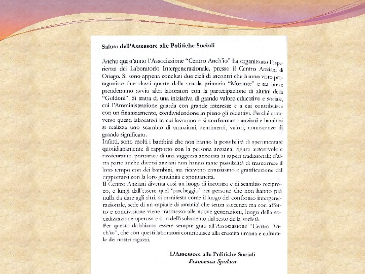Fine üSi ringraziano gli anziani che ogni martedì si riunivano per accogliere gli alunni e preparavano una merenda da condividere üSi ringrazia il Comune e tutti gli Enti che hanno patrocinato l’iniziativa üSi ringrazia la Dirigente Scolastica che ha avvalorato le finalità didattiche e sociali del progetto üSi ringraziano i genitori che hanno appoggiato la proposta degli insegnanti e hanno preparato in diverse occasioni gustose e deliziose merende üSi ringraziano gli alunni per l’entusiasmo , la volontà e l’impegno dimostrato üSi ringraziano tutti coloro che hanno reso possibile con il loro contributo la realizzazione di questo progetto