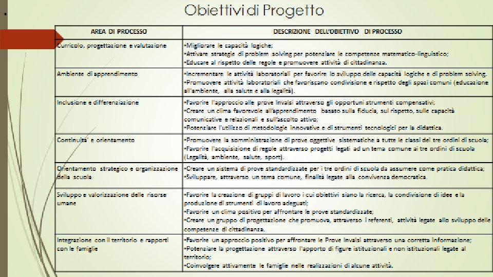 PRIORITA’, TRAGUARDI E OBIETTIVI DESUNTI DAL RAV • Le priorità che l’Istituto si è assegnato per il prossimo triennio sono: • Miglioramento dei risultati nelle prove standardizzate nazionali • Sviluppo delle competenze sociali nella scuola dell'infanzia, primaria e secondaria. • Incidenza degli apporti disciplinari nelle competenze chiave e di cittadinanza I traguardi che l’Istituto si è assegnato in relazione alle priorità sono: 1. 2. 3. 4. Portare la percentuale di alunni che si posizionano nei livelli 1 e 2 all'interno della media nazionale. Portare la variabilità tra le classi all'interno della media del sud e isole. Miglioramento delle competenze chiave e di cittadinanza in tutti e tre gli ordini di scuola dell’Istituto (infanzia, primaria e secondaria di primo grado); Sviluppare competenze in materia di cittadinanza attiva e democratica, in relazione allo sviluppo dell'età evolutiva.