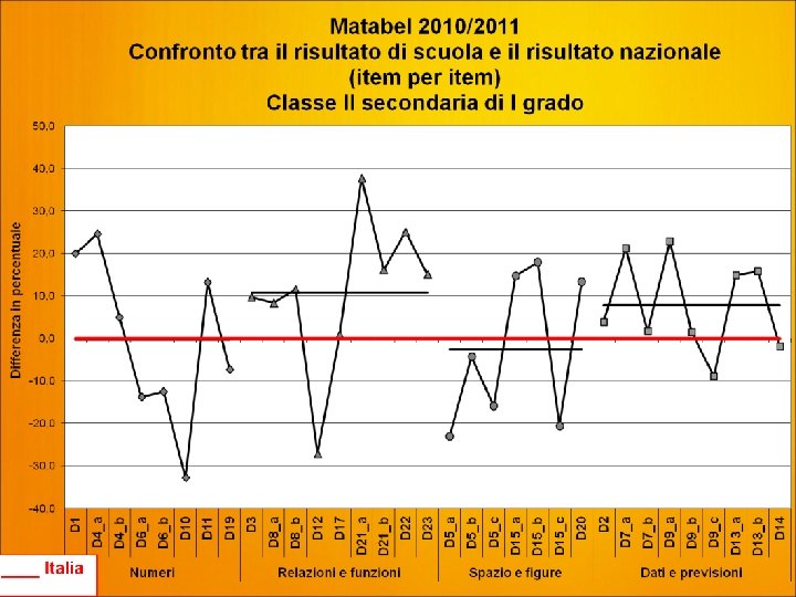 Ambiti e Argomenti MATEMATICA Domande Analisi risultati degli studenti Analisi difficoltà degli studenti Numeri D 10 0% risposte corrette rispetto a 32, 6% media M@t. abel - 32% Difficoltà nella risoluzione di problemi, operando con le unità di misura decimale Liv. Molto - basso Numeri D 6 a 36, 3% risposte corrette rispetto a 50, 1% media M@t. abel - 14 % Carenze nell’applicazione di principi di figure episcomponibili liv. Medio - basso Numeri D 6 b 27, 2% risposte corrette rispetto a 50, 1% media M@t. abel - 23 % Carenze nell’applicazione di principi di figure episcomponibili liv. Medio - basso Numeri D 19 27, 2% risposte corrette rispetto a 34, 5% media M@t. abel -7% Incertezze nella capacità di calcolo e nell’applicazione di regole e proprietà liv. Medio - basso
