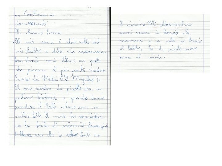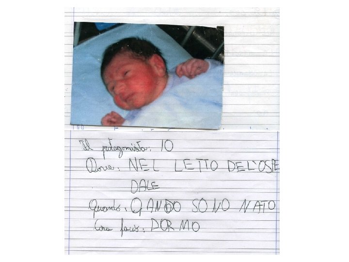 Le interviste vengono lette in classe. Anche il bambino D. S. A. può leggere la sua agli altri e partecipare al lavoro collettivo della classe. • Si discute sulle informazioni raccolte • viene ricostruita la situazione comunicativa • si descrive, sempre oralmente, “come ero…” tenendo conto degli elementi emersi dall’intervista. Tutti i bambini, compreso l’alunno D. S. A. , trasformano autonomamente il testo-intervista in narrazione scritta.