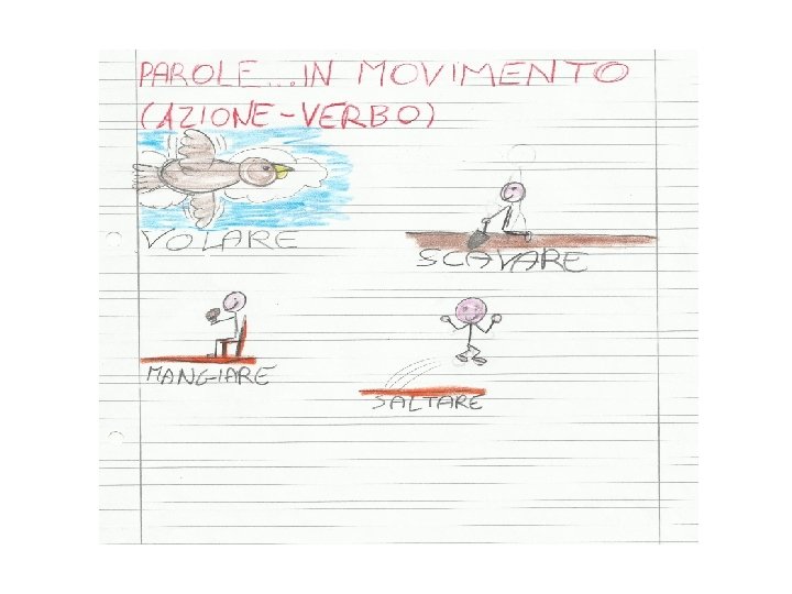IL VERBO • Si consolida il concetto di verbo- azione- informazione • giochi di mimo: “Indovina!” (rappresentazioni a coppie eo piccoli gruppi di azioni “di quando erano piccoli”) • Durante la rappresentazione i bambini non coinvolti devono indovinare : B. : <<Ride, piangono, ridono, mangiano, gattonano…>> LA RAPPRESENTAZIONE GIOCOSA MOTIVA IL BAMBINO D. S. A. AD APPRENDERE E LO STIMOLA AD ESPRIMERE AL MEGLIO LA PROPRIA CREATIVITA’.
