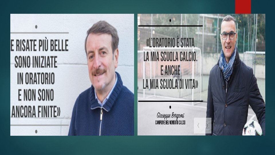 � Questa seconda dimensione relazionale, si trova ben espressa nell’esperienza: “Cresciuti in oratorio” promossa da FOM e ODL � In una piattaforma visibile a tutti, chiunque ha esperienze di crescita e di vita di fede, può condividere video musicali, video di racconti, articoli per testimoniare come l’oratorio ha segnato il proprio percorso di vita. � Tra i testimonial di questo progetto che unisce giovani e adulti: Giacomo � Giacomo Poretti attesta che l’oratorio è stato il luogo del suo esordio in teatro e ha chiesto ai ragazzi di raccontare con parole, immagini e video le esperienze speciali vissute all’oratorio. Il video è stato poi presentato a Venezia nei giorni della 74 mostra Internazionale dell’arte cinematografica. � Il musicista Davide Van de Sfroos, attraverso questa iniziativa, invita le band degli oratori a inviargli il video di una loro canzone. Il cantante stesso seleziona i tre gruppi vincitori del laboratorio musicale, che si esibiranno come apripista al suo concerto a San Siro. Poretti.