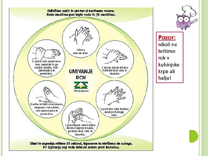 UMIVANJE ROK Kakšne morajo biti roke preden začnemo pripravljati jed? Koža in roke morajo biti: Brez vidnih gnojnih sprememb Čiste Brez nakita in ročnih ur ZAKAJ?