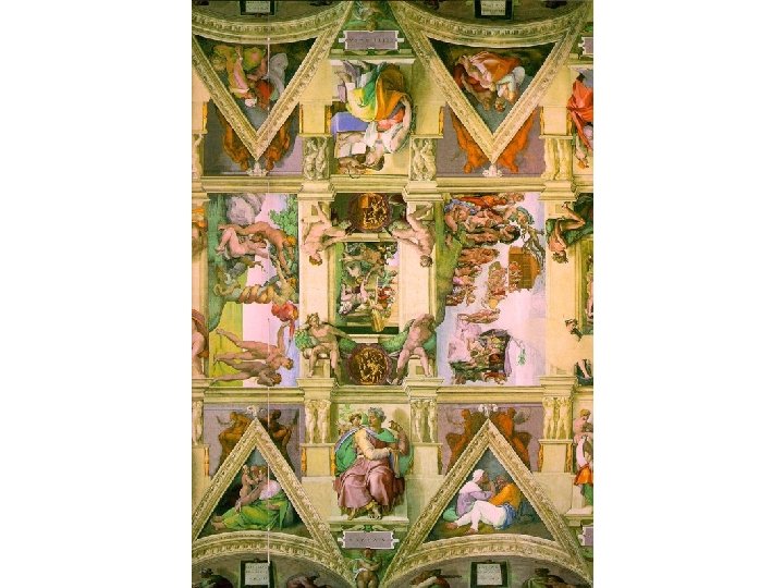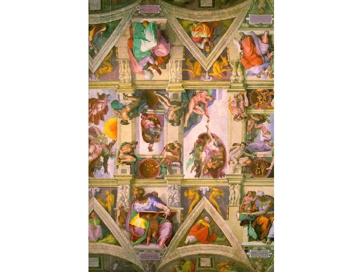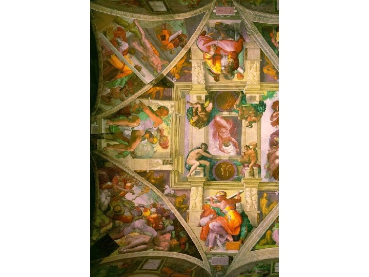 The Last Judgement, from the altar of the Sistine Chapel (painted after the ceiling) The central figure is Christ. Notice the size and distortion of proportion. )