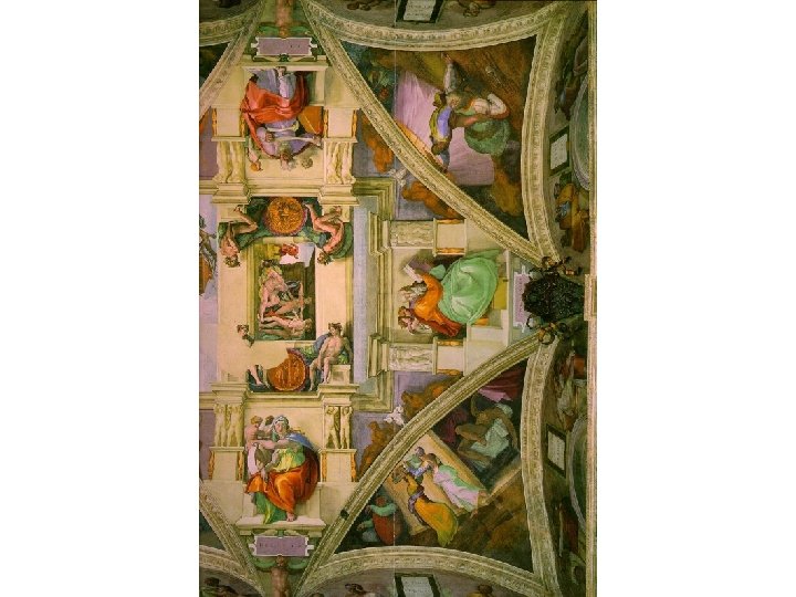 Michelangelo’s masterpiece is the Sistine Chapel ceiling, done between 1508 and 1512, by order of Pope Julius II. Michelangelo was working on the Pope’s tomb (before he was even dead!) and did not want to do the ceiling. He argued that he was a sculptor, not a painter, but Julius insisted. Michelangelo suspended work on the tomb (and its massive sculpture of Moses) to paint the ceiling. Here are four views of the ceiling, moving from the left side to the right.