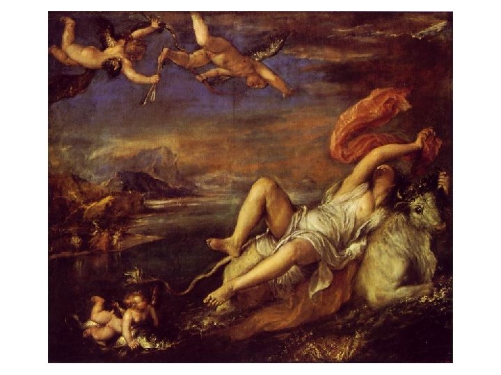 Titian (1477 -1576) Titian is considered the last of the Italian Renaissance artists (maybe because he lived to be 99 years old!) He was a High Renaissance artist of the Venetian School. His two famous works are Venus and Adonis (c. 1555) and the Rape of Europa (1559 -62). Notice, again, the use of mythological figures, not religious.