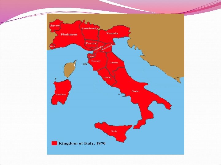 Garibaldi’s Campaign in Southern Italy If Mazzini was the soul of the unification process, then Garibaldi was the hero He recruited soldiers from Genoa to go to Sicily The expedition of soldiers was an instant hit Garibaldi’s red shirts had tremendous success He wanted Rome, but this worried Cavour like a fox, started uprisings in papal states, and sent Piedmonts army to stop it 1860, 2/3 of papal states joined piedmont, and Rome was left alone. Him and his troops marched south Sept 18, Garibaldi gave up command of his army, shook hands with Victor Emmanuel – unity of Kingdom of Italy in 1861