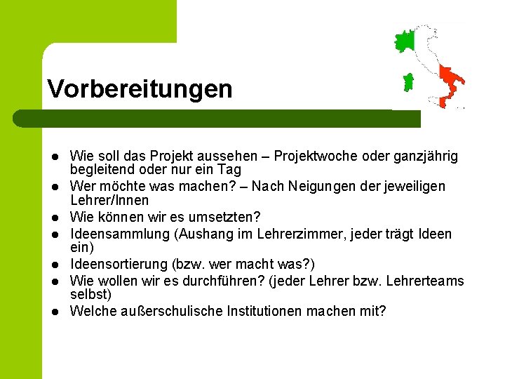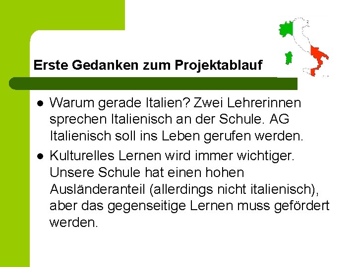 Erste Gedanken zum Projektablauf l l Warum gerade Italien? Zwei Lehrerinnen sprechen Italienisch an der Schule. AG Italienisch soll ins Leben gerufen werden. Kulturelles Lernen wird immer wichtiger. Unsere Schule hat einen hohen Ausländeranteil (allerdings nicht italienisch), aber das gegenseitige Lernen muss gefördert werden.