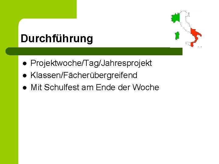 Kooperation mit anderen Institutionen • Einladen des Kindergartens • Schulfest am Ende der Projektwoche für Eltern, … • Evtl. Themenabende (Kochen, Vorträge, Film, etc. ) für Lehrer, Eltern • Ital. Restaurants als Sponsoren? • Ital. Geschäft besuchen