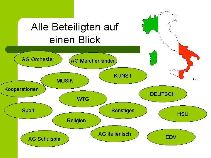 Alle Beteiligten auf einen Blick AG Orchester AG Märchenkinder KUNST MUSIK Kooperationen DEUTSCH WTG Sport Sonstiges HSU Religion AG Schulspiel AG Italienisch EDV