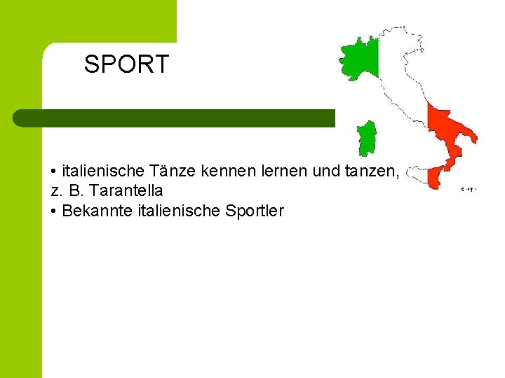 SPORT • italienische Tänze kennen lernen und tanzen, z. B. Tarantella • Bekannte italienische Sportler