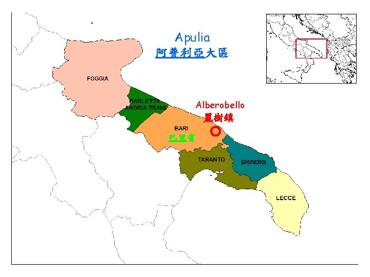 Trulli were built , side by side, along the hilly terrain 土盧里沿著丘陵起伏的地形比鄰而建