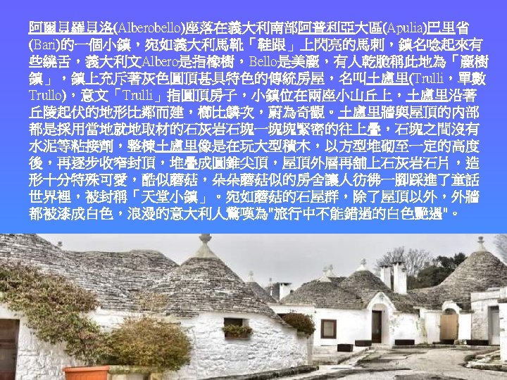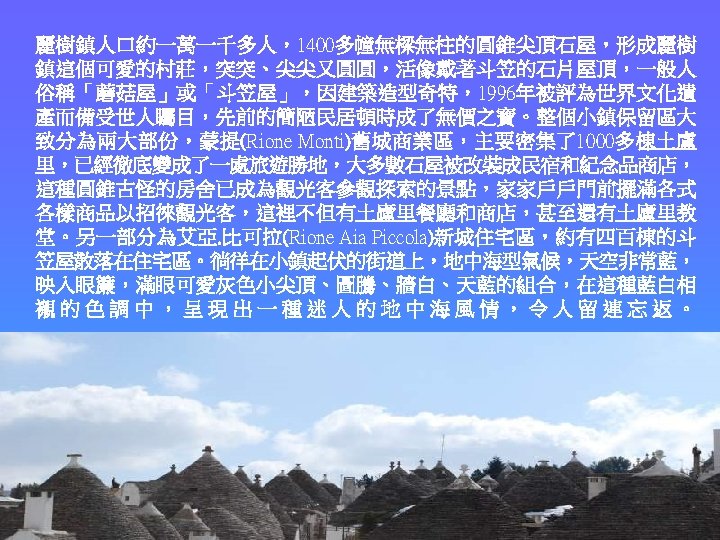 Approximately more than 1400 stone houses with conical spire to forms this lovely town Alberobello without any beam and column 約有1400多幢無樑無柱的圓錐尖頂石屋,形成麗樹鎮這個可愛的村莊