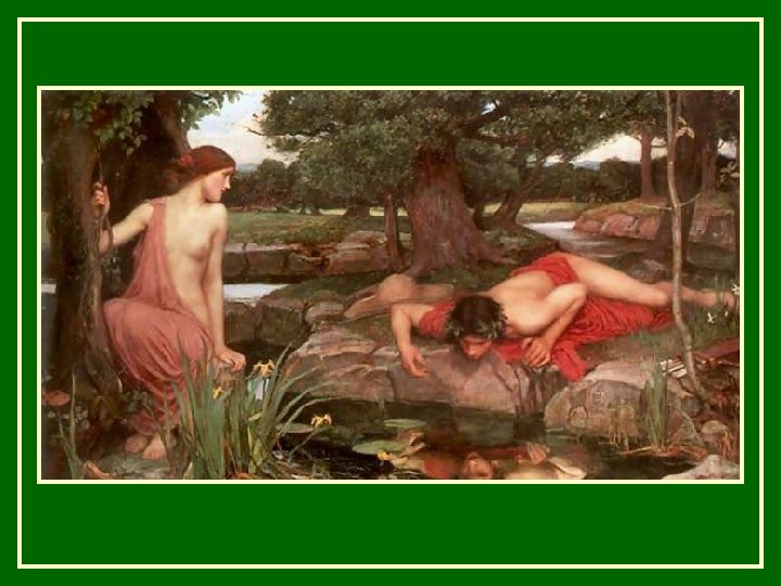 In Greek mythology, Narcissus was a young man of extraordinary beauty. He cruelly rejected many admirers, including the nymph Echo. One day, as he bent to drink from a pool, Narcissus saw his own reflection, and immediately fell in love with it. In some versions of the story, Narcissus tried to embrace his reflection, fell into the pool, and drowned In others, unable to tear himself away from his reflection, he wasted away and died. In either case, his obsession with his own beauty led to his death. The term “narcissism” is derived from the story of Narcissus. It refers to obsessive focus on oneself, particularly one’s physical appearance.