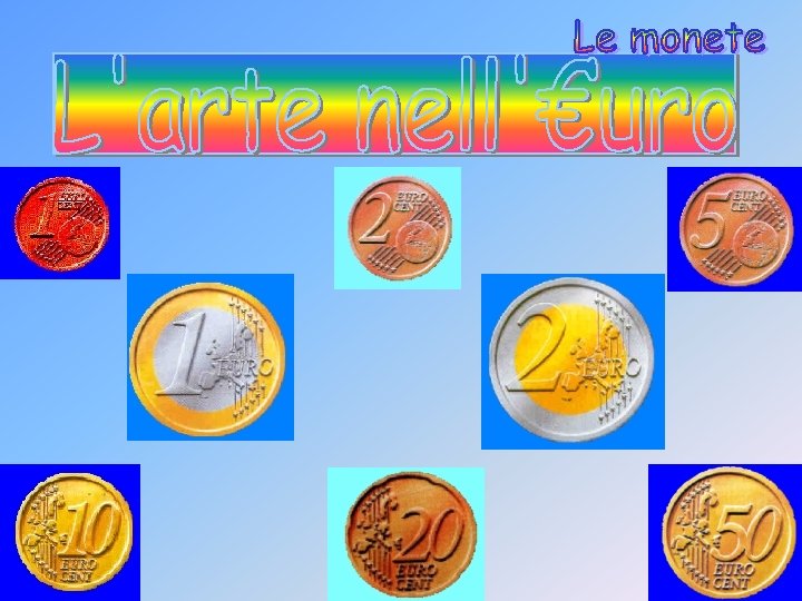 Le otto monete in euro (da 1, 2, 5, 10, 20 e 50 cent e da 1, 2 euro) possono essere facilmente riconosciute, poiché esse differiscono per aspetto dimensione e colore. Sulla faccia comune delle monete in euro sono riprodotte tre cartine dell’ unione europea contornate da 12 stelle. La faccia comune delle monete è identica per i 12 stati aderenti per l’area dell’ euro. L’ altra faccia reca invece un simbolo nazionale ed è diversa per ciascuno stato. Le monete possono essere utilizzate in tutta l’area, indipendentemente dal disegno impresso sulla faccia nazionale. Nel febbraio 1998 i telespettatori di RAI UNO hanno partecipato alla selezione dei bozzetti per la faccia nazionale delle monete. L'Italia ha deciso di riprodurre su ogni tipo di moneta un disegno differente, scelto fra i capolavori della sua tradizione artistica.