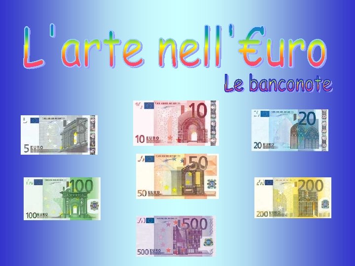 Le sette banconote in euro, il cui valore è compreso fra 5 e 500, possono essere facilmente riconosciute grazie alle loro caratteristiche visive e tattili. Ciascun biglietto è contraddistinto da un colore dominante e da dimensioni particolari. Sul fronte delle banconote sono riprodotte immagini di finestre e portali, che rappresentano lo spirito di apertura dell’ Europa contemporanea, mentre i ponti raffigurati sul retro simboleggiano la collaborazione fra i popoli europei, nonché fra l'Europa e il resto del mondo. Le 12 stelle dell’UE rappresentano invece il dinamismo e l’armonia tra le nazioni europee.