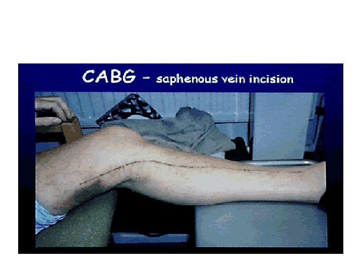 • • An open heart bypass surgery is performed under general anesthesia, which requires that the patient be on a ventilator during surgery. Surgery begins with harvesting the blood vessels that will become the grafts. The saphenous vein in the leg is commonly used because it is long enough to create multiple grafts. If the saphenous vein cannot be used, vessels from the arm can be used instead. The left internal mammary artery is used for a single graft and is taken once the chest is opened for surgery. • • Once the saphenous vein has been recovered, the chest is opened by making an incision along the sternum, or breastbone. The surgeon then cuts the sternum, allowing the chest cavity to be opened, giving the surgeon access to the heart. In the traditional CABG procedure, the heart is stopped with a potassium solution so the surgeon is not attempting to work on a moving vessel, and the blood is circulated by a heart-lung machine. At this time the heart-lung machine does the work of the heart and the lungs, and the ventilator is not used.