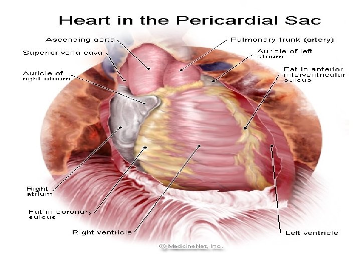 • Cardiac tamponade • If there is enough fluid in the pericardia sac, there may be enough pressure on the outside of the heart to prevent it from beating adequately to push blood to the body and lungs. • The pressure within the sac itself needs to be higher than the pressure within the heart chambers, but symptoms gradually progress as the heart function is compromised. • Treated by pericardiocentesis, a procedure where a long needle is inserted through the chest wall into the pericardial sac and fluid is removed. • This relieves the pressure within the sac and temporarily resolves the acute emergency. A plastic tube or catheter may be left in the chest until the underlying illness that cause the tamponade is addressed and further accumulation of fluid in the pericardium is prevented.