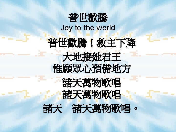 發出祢的亮光 Send forth your light 引導我 回轉向祢 Guide me turn back to You 願祢的榮耀降臨 May Your glory come 祢的榮光充滿全地 May Your glory fill the entire earth