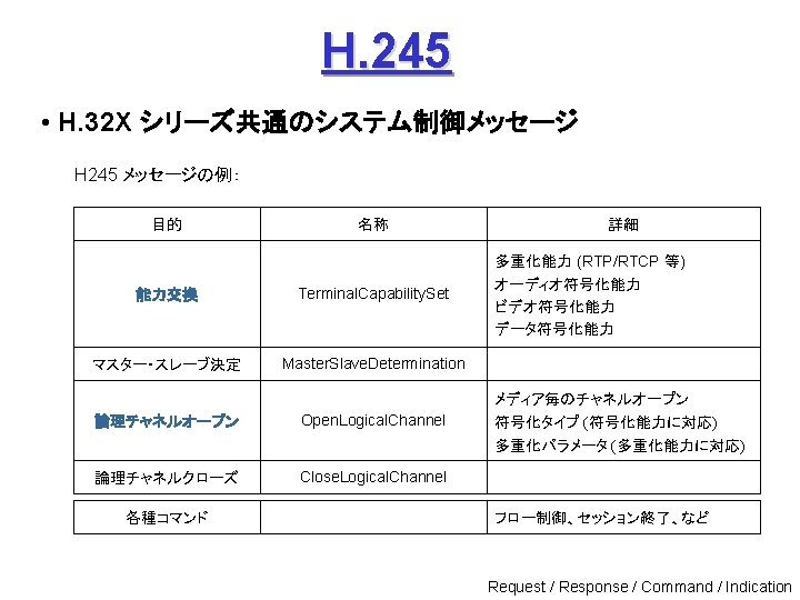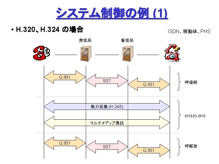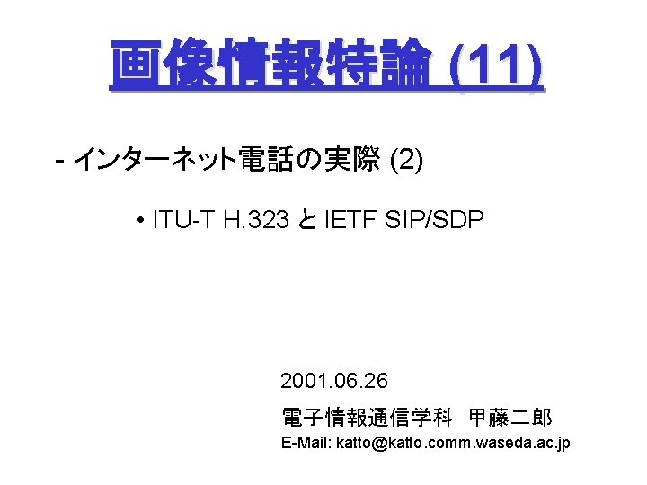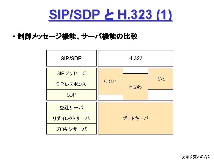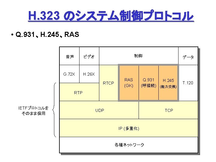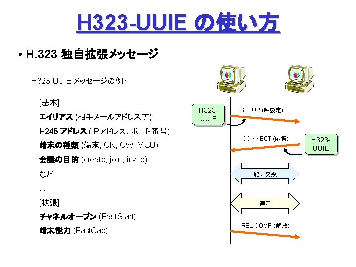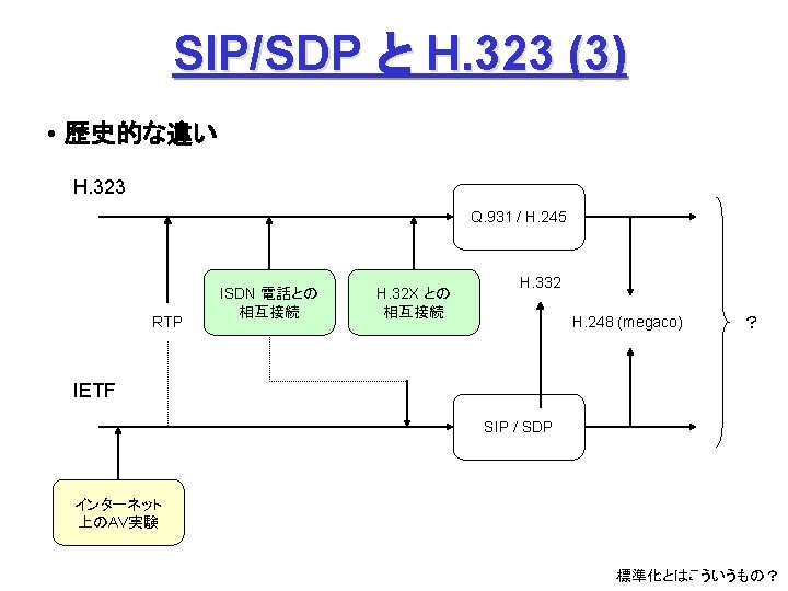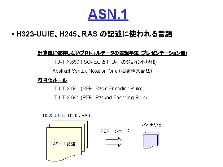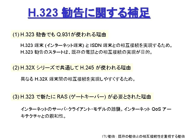 ITUT H 323 H 245 Q 931 1720 Slides: 27 Download presentation ITU-T H. 323 (続き) H. 245 手順の例 Q. 931 呼接続 (ポート1720) Terminal. Cap. Set. Ack 能力交換 Master. Slave H. 245 Master. Slave. Ack マスタ・スレーブ決定 Open. Logical. Channel. Ack RTP チャネル・オープン 通話 (RTP / RTCP) RAS 手順の例 アドミッション制御の例: (1) 直接型 (direct-routed) 端末 ゲートキーパー 端末 ARQ ACF (2) 間接型 (GK-routed) 端末 ゲートキーパー 端末 ARQ ポート番号 1719 SETUP ACF SETUP CALL PROC ポート番号 1719 SETUP CALL PROC ARQ ACF ALERTING CONNECT ASN. 1 記述の例 H 245 メッセージより抜粋: Video. Capability { non. Standard h 261 Video. Capability h 262 Video. Capability h 263 Video. Capability is 11172 Video. Capability. . . generic. Video. Capability } : : = CHOICE (選択) IS 11172 Video. Capability { constrained. Bitstream video. Bit. Rate video. Buffer. Size picture. Rate. . . } : : = SEQUENCE (系列) . . . Non. Standard. Parameter, H 261 Video. Capability, H 262 Video. Capability, H 263 Video. Capability, IS 11172 Video. Capability, Generic. Capability 詳細定義 ビデオ符号化能力 BOOLEAN, INTEGER (0. . 107341823) INTEGER (0. . 262143) INTEGER (0. . 15) OPTIONAL, MPEG 1 ビデオ符号化能力 補足 Fast. Connect / Faster. Connect 端末A Q. 931 端末B SETUP CALL PROC 端末 B の Fast. Start 端末 A の Fast. Start * H 245手順のスキップ H 245メッセージ (Open. Logical. Channel) ALERTING CONNECT (ACKを兼ねる) Fast. Connect (H 245 トンネリング): (H. 245) RTP 必要ない場合は スキップ Q 931メッセージにH 245メッセージを 含めてしまい、H 245手順を省略 Faster. Connect: TCP を、UDP + タイムアウトに置換 IETF SIP/SDP SIP/SDP の使い方 (1) 基本モード • Direct Q. 931/H. 245 の Fast. Connect と同様の手順 SDP INVITE (呼設定) 100 Trying 180 Ringing 対比: 200 OK SIP/SDP Q 931/H 245 INVITE 100 Trying 180 Ringing 200 OK ACK. . . BYE SETUP + H 245 CALLPROC ALERT CONNECT + H 245 (Open. Logical. Channel. Ack) H 245 + RELCOMP ACK (確認応答) 通話 BYE 200 OK SDP