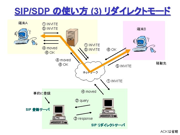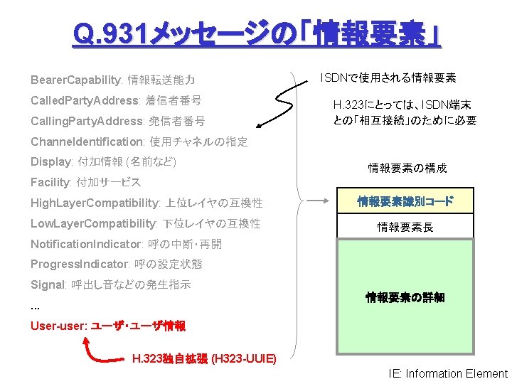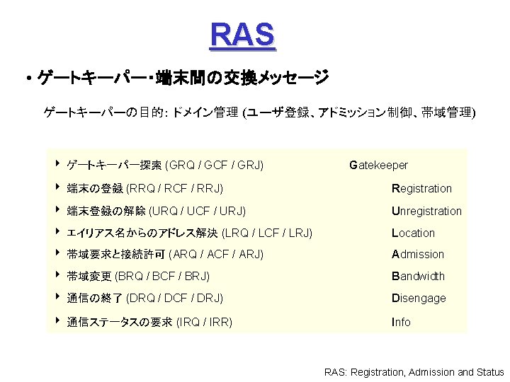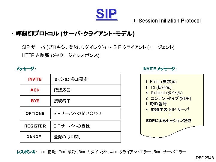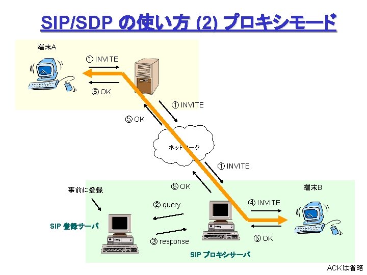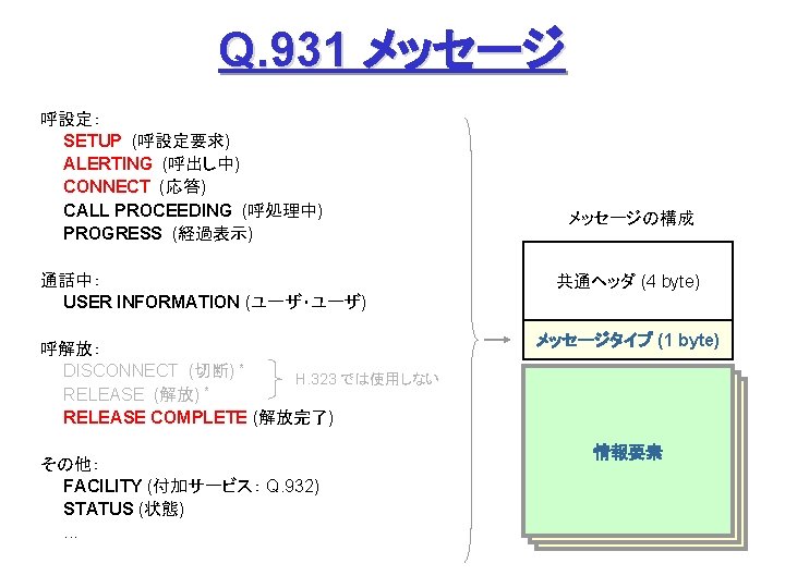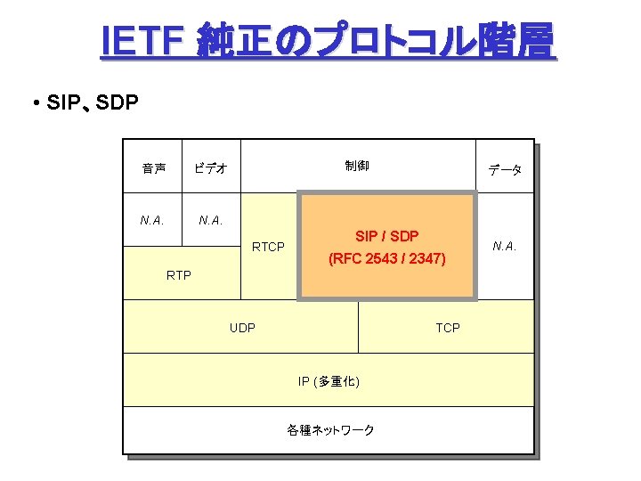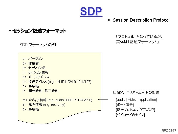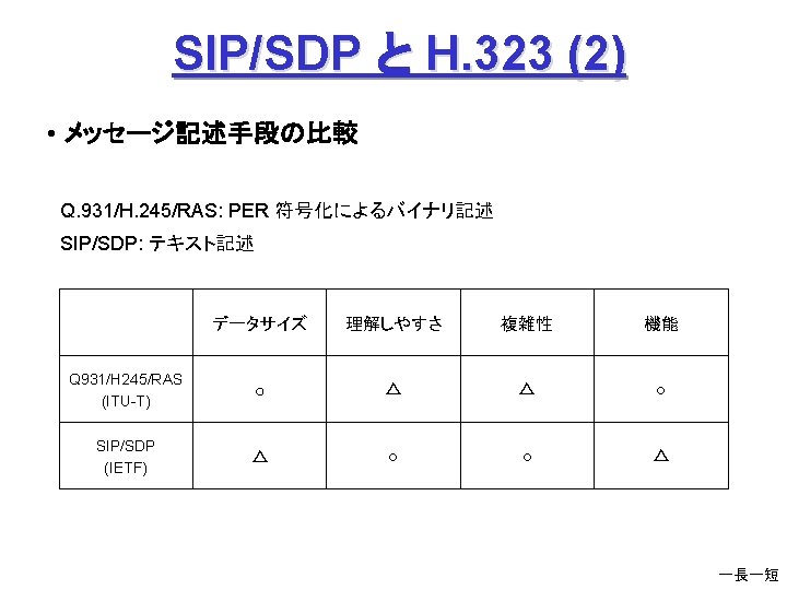 ITUT H 323 H 245 Q 931 1720 Slides: 27 Download presentation ITU-T H. 323 (続き) H. 245 手順の例 Q. 931 呼接続 (ポート1720) Terminal. Cap. Set. Ack 能力交換 Master. Slave H. 245 Master. Slave. Ack マスタ・スレーブ決定 Open. Logical. Channel. Ack RTP チャネル・オープン 通話 (RTP / RTCP) RAS 手順の例 アドミッション制御の例: (1) 直接型 (direct-routed) 端末 ゲートキーパー 端末 ARQ ACF (2) 間接型 (GK-routed) 端末 ゲートキーパー 端末 ARQ ポート番号 1719 SETUP ACF SETUP CALL PROC ポート番号 1719 SETUP CALL PROC ARQ ACF ALERTING CONNECT ASN. 1 記述の例 H 245 メッセージより抜粋: Video. Capability { non. Standard h 261 Video. Capability h 262 Video. Capability h 263 Video. Capability is 11172 Video. Capability. . . generic. Video. Capability } : : = CHOICE (選択) IS 11172 Video. Capability { constrained. Bitstream video. Bit. Rate video. Buffer. Size picture. Rate. . . } : : = SEQUENCE (系列) . . . Non. Standard. Parameter, H 261 Video. Capability, H 262 Video. Capability, H 263 Video. Capability, IS 11172 Video. Capability, Generic. Capability 詳細定義 ビデオ符号化能力 BOOLEAN, INTEGER (0. . 107341823) INTEGER (0. . 262143) INTEGER (0. . 15) OPTIONAL, MPEG 1 ビデオ符号化能力 補足 Fast. Connect / Faster. Connect 端末A Q. 931 端末B SETUP CALL PROC 端末 B の Fast. Start 端末 A の Fast. Start * H 245手順のスキップ H 245メッセージ (Open. Logical. Channel) ALERTING CONNECT (ACKを兼ねる) Fast. Connect (H 245 トンネリング): (H. 245) RTP 必要ない場合は スキップ Q 931メッセージにH 245メッセージを 含めてしまい、H 245手順を省略 Faster. Connect: TCP を、UDP + タイムアウトに置換 IETF SIP/SDP SIP/SDP の使い方 (1) 基本モード • Direct Q. 931/H. 245 の Fast. Connect と同様の手順 SDP INVITE (呼設定) 100 Trying 180 Ringing 対比: 200 OK SIP/SDP Q 931/H 245 INVITE 100 Trying 180 Ringing 200 OK ACK. . . BYE SETUP + H 245 CALLPROC ALERT CONNECT + H 245 (Open. Logical. Channel. Ack) H 245 + RELCOMP ACK (確認応答) 通話 BYE 200 OK SDP