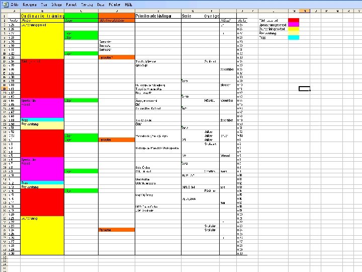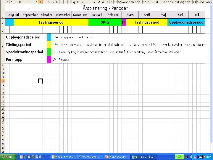 Upprättande av plan Planering (Spelare och ledare) - Årsplan för tävling (säsong) - Årsplan för träning (säsong) perioder och deras inriktning - Periodplan för tävling (prestation och ev resultat) - Periodplan för träning (periodens inriktning och mål) - Veckoplan för träning (veckans utseende)