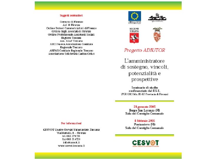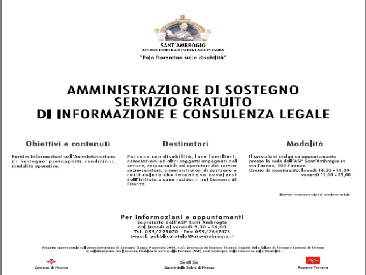 L’Amministrazione di Sostegno Il Tavolo di Coordinamento cittadino LA COMPOSIZIONE • Comune di Firenze • A. S. L. 10 di Firenze • Tribunale di Firenze • Procura della Repubblica di Firenze • Amministrazione penitenziaria • ASP Sant’Ambrogio – “Polo cittadino sulla disabilità”