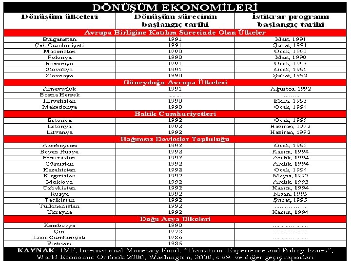 IMF’e GÖRE EKONOMİK DÖNÜŞÜM POLİTİKALARININ TANIMLANMASI Kaynakların en etkili şekilde kullanılmasını sağlayacak şekilde yeniden dağıtımın sağlanması yanında, piyasa işleyişlerinin, fiyatların ve ekonomik aktivitenin liberalize/serbestleştirilmesi edilmesi. Bir başka deyişle kaynak dağıtım mekanizmasının değişmesi. Makroekonomik istikrarın sağlanması için, dolaylı ve piyasa-kaynaklı enstrümanların geliştirilmesi Genellikle özelleştirme aracılığıyla etkili bir girişim yönetiminin ve ekonomik etkinliğin başarılması. Kısacası mikro ekonomik yapılandırma Etkinliği geliştirecek inisiyatifleri sağlayan sıkı bütçe kısıtlamalarının uygulamaya geçirilmesi Mülkiyet haklarını, hukuk kurallarının hâkimiyetini ve şeffaf bir piyasagiriş düzenlemelerini garanti edecek kurumsal ve yasal bir çerçevenin oluşturulması