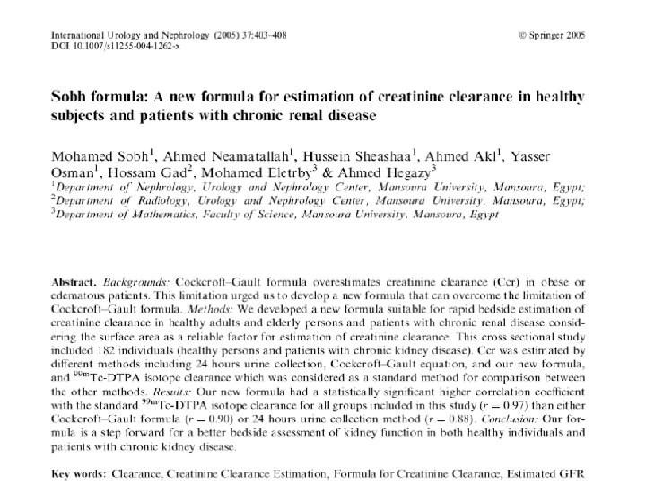 Limitações das Equações • High prevalence of stage 3 chronic kidney disease in older adults despite normal serum creatinine. Duru OK, Vargas RB, Kermah D, Nissenson AR, Norris KC. Division of General Internal Medicine, University of California, Los Angeles, CA 90095, USA. kduru@mednet. ucla. edu BACKGROUND: Serum creatinine is commonly used to diagnose chronic kidney disease (CKD), but may underestimate CKD in older adults when compared with using glomerular filtration rates (e. GFR). The magnitude of this underestimation is not clearly defined. OBJECTIVE: Using the Modification of Diet in Renal Disease (MDRD) equation, to describe both the prevalence and the magnitude of underestimation of stage 3 CKD (GFR 30 -59 ml/min/1. 73 m(2)), as well as ideal serum creatinine cutoff values to diagnose stage 3 CKD among Americans > or =65 years of age. DESIGN: Cross-sectional. PARTICIPANTS: A total of 3, 406 participants > or =65 years of age from the 1999 -2004 National Health and Nutrition Examination Surveys (NHANES). MEASUREMENTS: Serum creatinine levels were used to determine e. GFR from the MDRD equation. Information on clinical conditions was self-reported. RESULTS: Overall, 36. 1% of older adults in the US have stage 3 or greater CKD as defined by e. GFR values. Among older adults with stage 3 CKD, 80. 6% had creatinine values < or =1. 5 mg/dl, and 38. 6% had creatinine values < or =1. 2 mg/dl. Optimal cutoff values for serum creatinine in the diagnosis of stage 3 CKD in older adults were > or =1. 3 mg/dl for men and > or =1. 0 mg/dl for women, regardless of the presence or absence of hypertension, diabetes, or congestive heart failure. CONCLUSION: Use of serum creatinine underestimates the presence of advanced (stage 3 or greater) CKD among older adults in the US. Automated e. GFR reporting may improve the accuracy of risk stratification for older adults with CKD. Rule et al. Using serum creatinine to estimate glomerular filtration rate: accuracy in good health and in chronic kidney disease. Ann Intern Med 2004; 141: 929 -37.